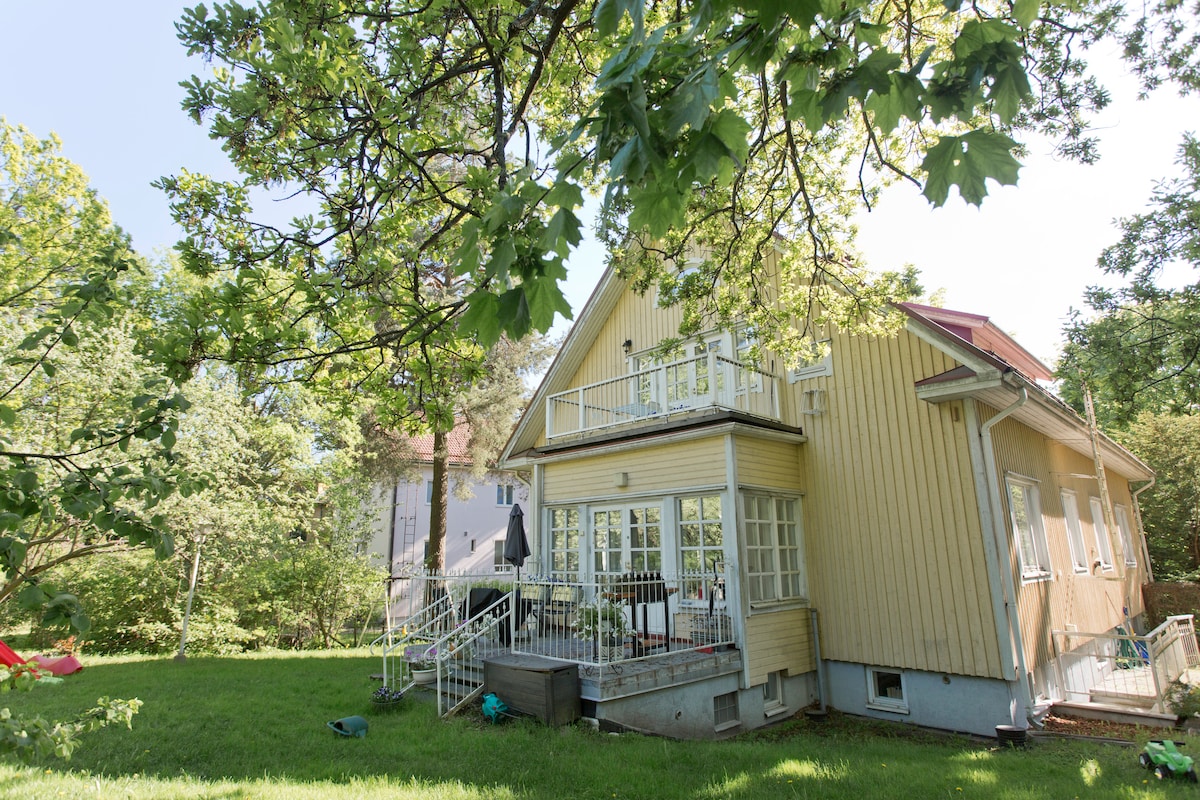Wejdź przez prywatne tylne drzwi wychodzące na ogród. Drewniany dom, który znajduje się nad apartamentem w piwnicy, został zbudowany w latach 30-tych XX wieku. Znajduje się przy cichej ulicy, w otoczeniu podobnych drewnianych domów. Apartament jest odpowiedni dla jednej osoby, pary lub młodej czteroosobowej rodziny, z podwójnym łóżkiem i rozkładaną sofą. Będziesz mieć dostęp do własnej łazienki, toalety i sauny. Mały salon i oddzielna jadalnia obsługiwane przez kuchnię i pralnię (pralka i suszarka) z pełnowymiarowymi urządzeniami.