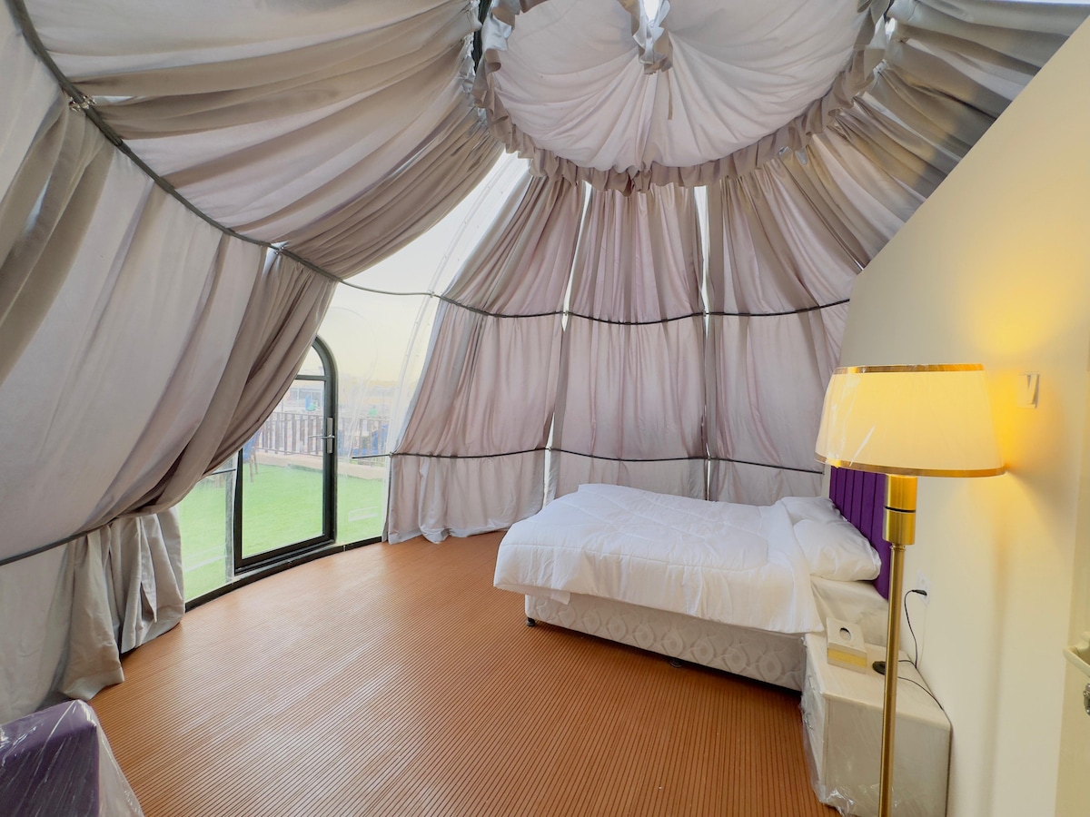 This beautiful setup is located in Total Support Desert Camp and features a luxurious bubble-style glamping dome with a cozy double bed, elegant drapes, ambient lighting, and a wooden floor. The transparent dome ceiling gives a perfect view of the desert sky — ideal for romantic getaways, stargazing, or simply enjoying the serenity of the dunes in comfort.