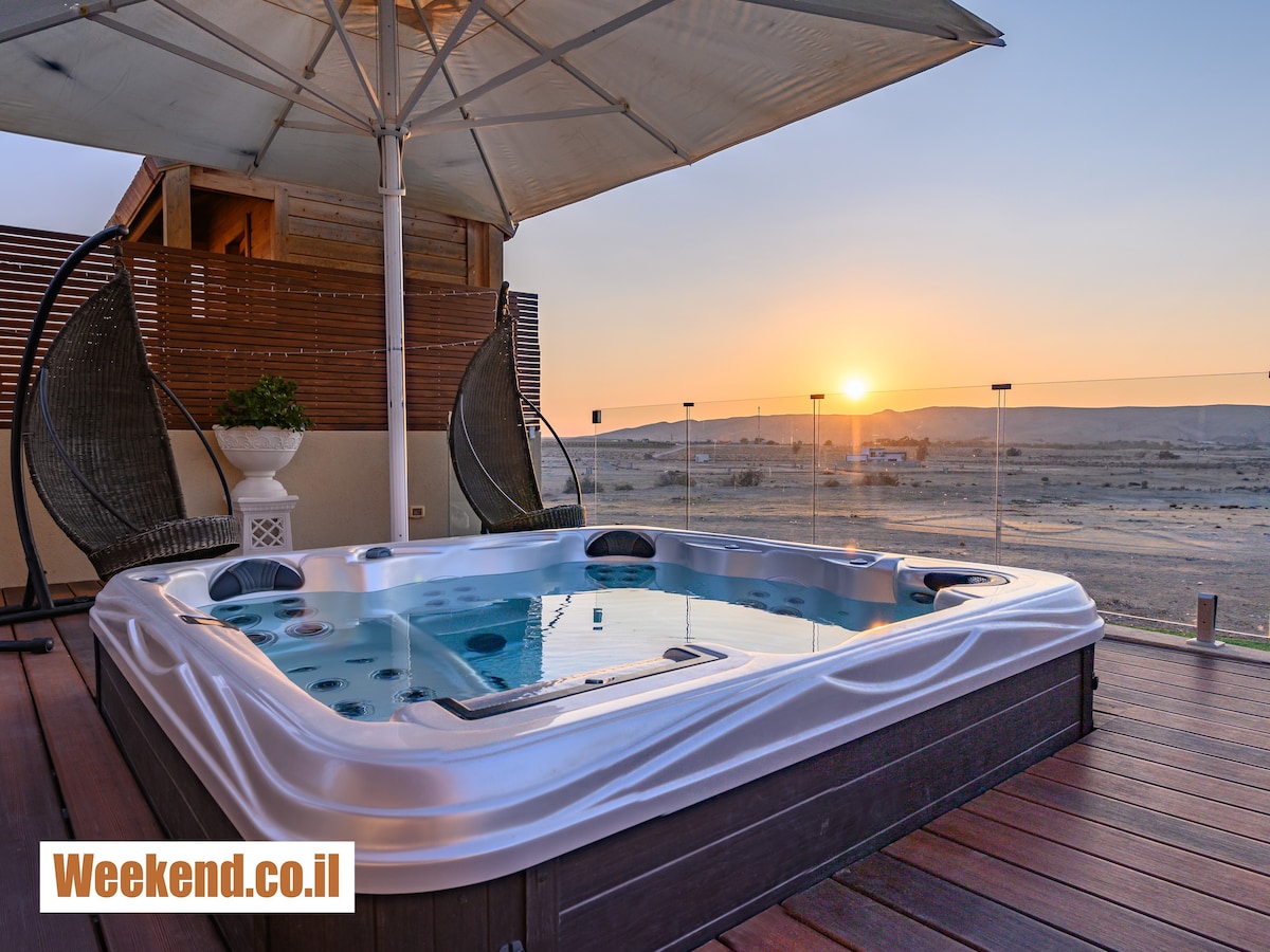 Nowoczesny wiejski pensjonat z pełną prywatnością – „A Moment in Time”, Arad. Pojedynczy, odosobniony pensjonat, w którym panuje atmosfera pustynnej ciszy i prawdziwego oderwania od świata. Duże i luksusowe jacuzzi z otwartym i zapierającym dech w piersiach widokiem. Odpowiednie dla par szukających romantycznego miejsca i całkowitej prywatności, A także dla rodzin liczących do 5 osób, które chcą spokoju. W pełni wyposażona kuchnia ze wszystkim, czego potrzebujesz do komfortowego pobytu. Dwa prywatne podwórka: Małe podwórko na relaksującą poranną kawę, I duży dziedziniec z kanapą i jacuzzi na widoku. Oddzielne wejście. Z ośrodka i ogrodu roztacza się widok na Pustynię Judejską. Ciche, kameralne i pastoralne miejsce na pobyt Idealne miejsce na zapierający dech w piersiach postój i całkowite odłączenie się od świata.