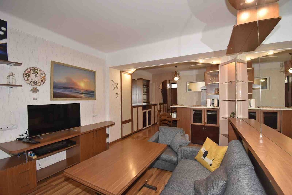 1 łóżko typu king size (szerokość 180 cm), 2 pojedyncze łóżka (szerokość 100 cm) + rozkana sofa, 93 m², 12/12 piętro (z windą) nowy budynek, otwarty balkon, stolik kawowy, stół jadalny dla 4 osób, stół roboczy, świeże czyste ręczniki, pościel, poduszki, koce, żelazko i suszarka do włosów, ciepła woda, system ogrzewania i klimatyzacja, w pełni wyposażona kuchnia, lodówka z zamrażarką, pralka, czajnik elektryczny, kuchenka gazowa, piekarnik, kuchenka mikrofalowa, 3 telewizory LED 32" smart, telewizja kablowa, Wi-Fi. Chętnie zaoferuję również wycieczki po Armenii (np. Garni, Geghard, Sevan, Dilijan, klasztor Tatev itp.), a także usługę wynajmu samochodów. Apartament znajduje się tuż obok centrum handlowego Dalma Garden i kilka metrów od Pomnika Ludobójstwa Ormian i Muzeum, Fabryki Brandy w Erywaniu i głównego dworca autobusowego. Plac Wielkiej Republiki znajduje się w odległości 25 minut spacerem. W odległości 100 m znajduje się przystanek autobusowy z licznymi autobusami i mikrobusami do wszystkich dzielnic miasta. Codzienne sprzątanie wliczone w cenę. To jest nowa oferta. Możesz sprawdzić wszystkie recenzje na kontach współgospodarza i w innych ofertach apartamentów.