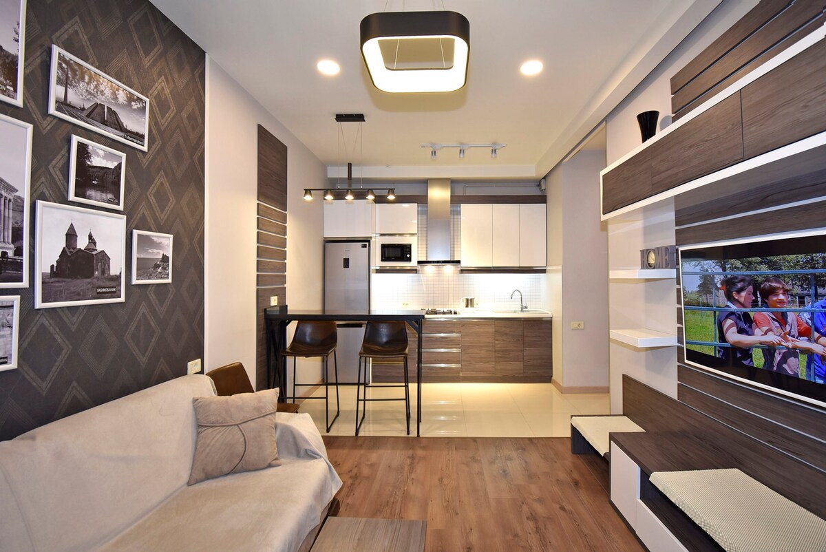 Located in the modern part of Yerevan these Studio apartments are ideal if you are travelling with family or friends. With its modern style, fully equipped kitchen and warm atmosphere its will give you a possibility to fully enjoy your trip in Yerevan. The strategic position will allow you to easily walk to all major points of tourist and historical interest that the city offers. Here you will also find many cafes and restaurants where you can taste the authentic Armenian lifestyle.