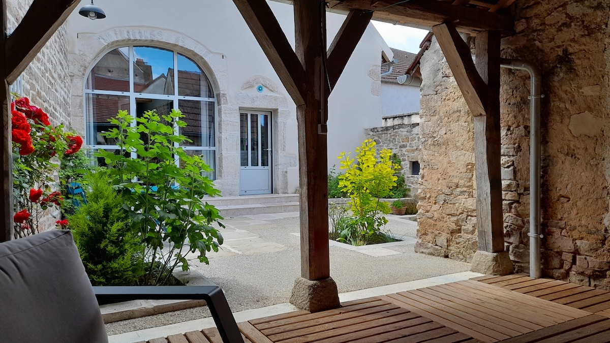 Mieszkanie znajduje się w XV-wiecznej rezydencji, odnowionej w 2019 roku. Urok kamieni, drewna i starego został zachowany, łącząc się z nowoczesnością. Z widokiem na wewnętrzny dziedziniec, z zieloną ścianą, która sprawi, że zapomnisz, że jesteśmy w samym sercu Poligny, stolicy hrabstwa. Poligny znajduje się w pobliżu Arbois, Dole, Lons le Saunier. Możesz również cieszyć się relaksującym odpoczynkiem w naszym prywatnym SPA (basen, łaźnia skandynawska, sauna na podczerwień).