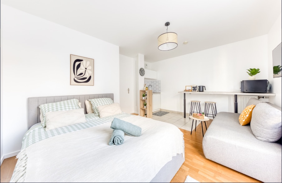 O rzut kamieniem od Paryża, to ciche i dobrze rozplanowane studio jest idealne na miejski wypad lub podróż służbową. Znajdziesz tu zoptymalizowany salon z sofą, w pełni wyposażoną kuchnię, a także nowoczesną kabinę prysznicową. Zaprojektowany z myślą o Twojej wygodzie, ma Wi-Fi, Smart TV, pościel i wszystko, czego potrzebujesz, aby połączyć pracę i relaks ze spokojem ducha. PRZY KAŻDEJ REZERWACJI WYMAGANY BĘDZIE DEPOZYT.