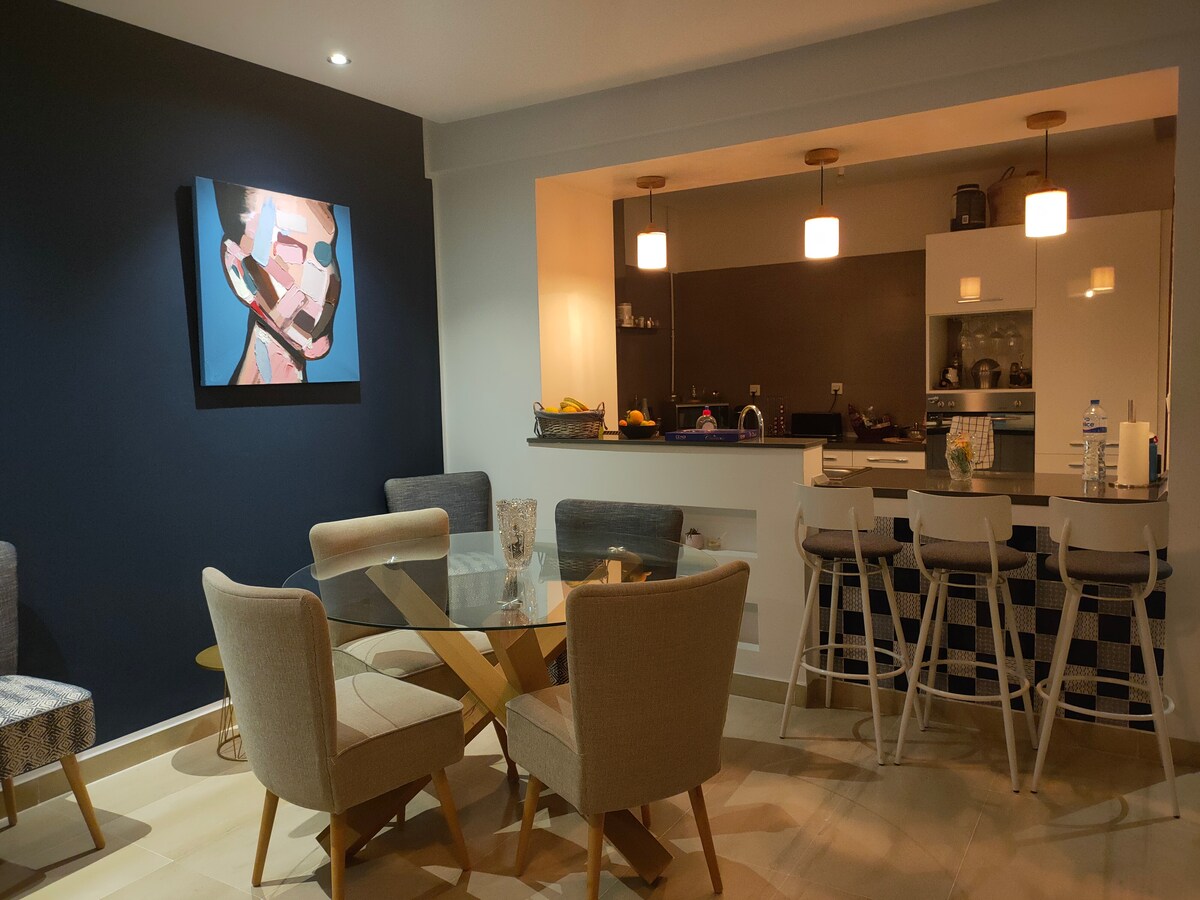 Relax in this quiet and elegant accommodation located in Ain Zaghouan Nord La Marsa. A beautiful, fully furnished apartment. Fully equipped kitchen open to the living room. Living room with 50-inch smart TV and Netflix subscription available. Spacious bedroom with a large queen size bed and large wall-mounted dressing room for more storage. A superb dressing table equipped with a pouf to make yourself look beautiful before heading out for the evening. An outdoor terrace that leaves you amazed