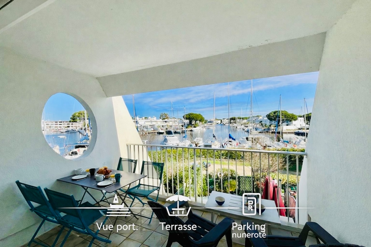 Studio cabine de 28m2 tout équipé avec une terrasse de 9m2 vue sur la Marina et ses bateaux . Détente et déconnexion garantie !! Exposé Est, le soleil vous réveillera en douceur et vous permettra de profiter de la terrasse toute la journée . Vous avez une place de parking privée au sein de la résidence qui est fermée par des portails électriques. A 10 mins à pieds des plages sauvages de Port Camargue, à 5 mins à pieds des supérettes, restaurants, laverie ...
