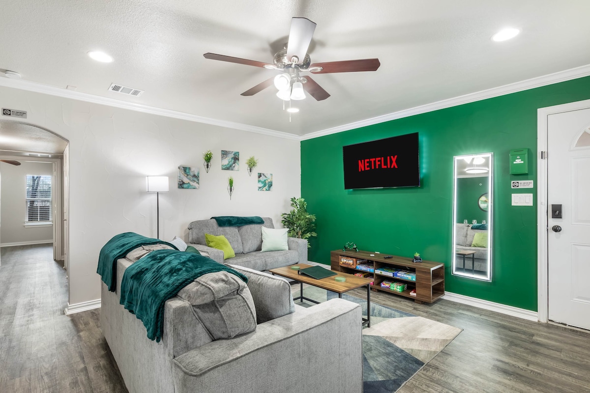 Męska jaskinia w Arlington spotyka się z komfortem 6 minut spacerem przez park do stadionu AT&T, Globe Life Park lub stadionu Choctaw! Nie tylko miejsce na pobyt, ale i na zabawę! Zagraj w bilard lub rzutki, oglądając ulubione programy na naszym 65-calowym telewizorze 4k HDTV. Zrelaksuj się w stylu dzięki luksusowej pościeli i ręcznikom, każdy pokój z własnym telewizorem, lub ciesz się prywatnym podwórkiem z grami typu tailgating. Apartament na parterze z BEZPŁATNYM miejscem parkingowym – brak jazdy lub taksówki w dniu meczu to prawdziwy bonus. 5 minut jazdy do Six Flags i HH!