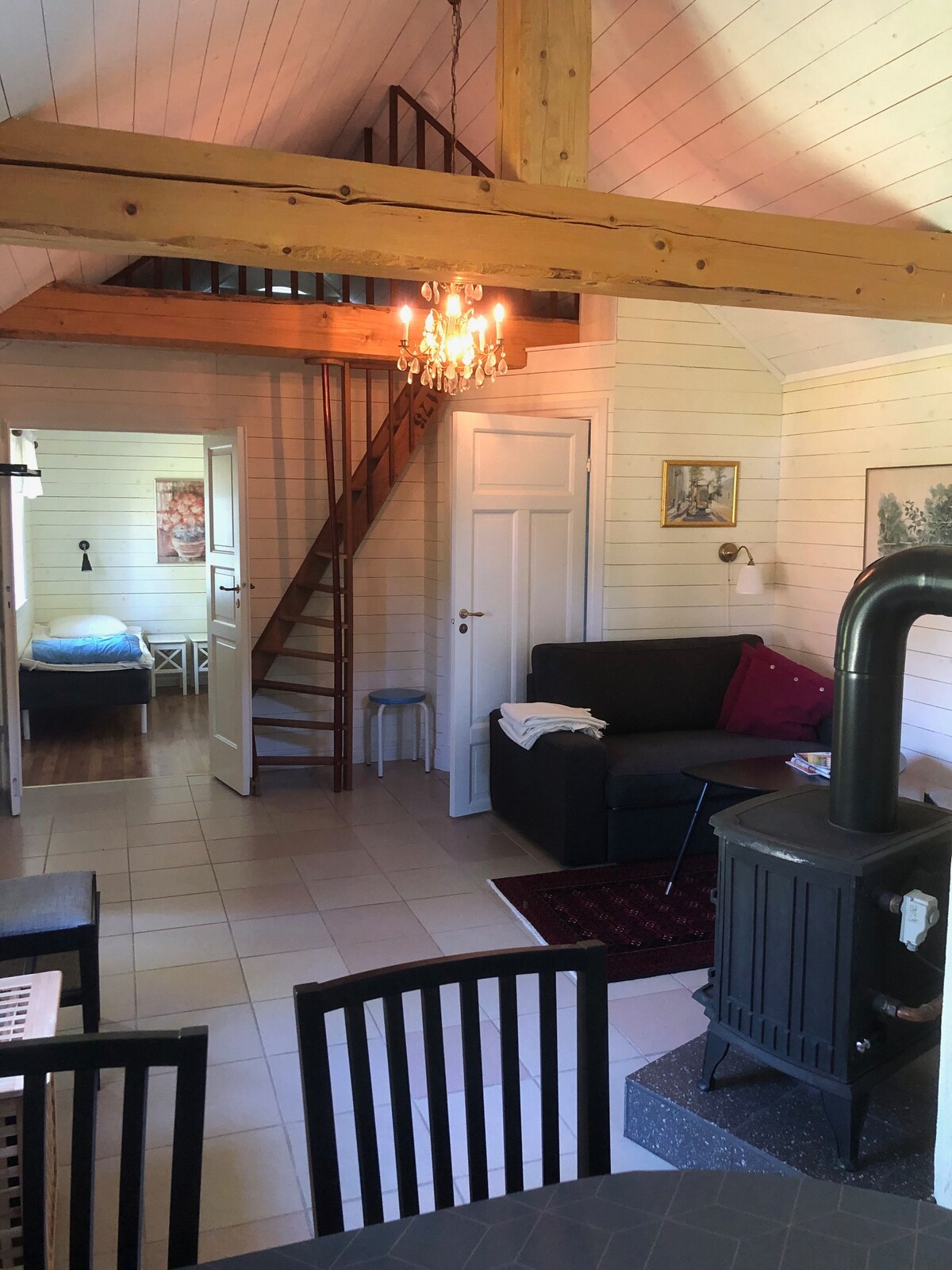 Nowo wyremontowane w 2024 roku, teraz wysokie sufity i prysznic w pomieszczeniu. Przytulny domek żołnierza o powierzchni około 25 m2. Pokój z 2 łóżkami i 1 łóżkiem na poddaszu, toaletą,prysznicem. Kuchnia z jadalnią. Kuchnia wyposażona jest w lodówkę/zamrażarkę, kuchenkę i piekarnik, mikrofalówkę, ekspres do kawy. Domek jest przytulny, nieco ustronny na willi z ładnym sadem, Zabawa, niezwykłe rośliny w ogrodzie. Okrąg 1,9 m wysokości sufitu w kuchni. Inne obszary wysokie sufity. 2-3 minuty spacerem do pizzerii i sklepu (ÖoB). Sklep spożywczy 2 km. 3,6 km do Färjestaden.3, 8 km od Ölandsbron.