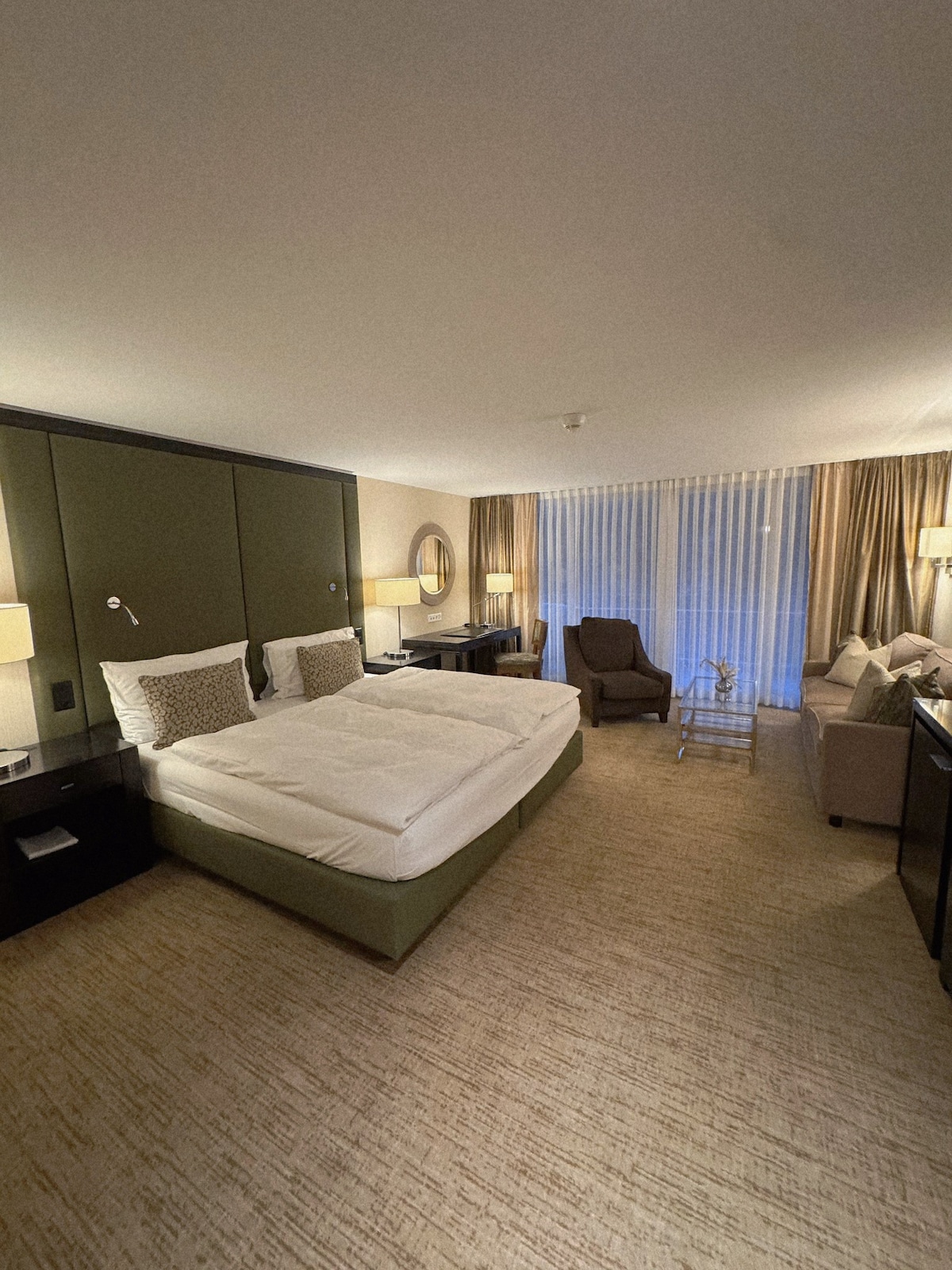 Welcome to the Belmont. This bright and stylish room offers the perfect blend of comfort and alpine sophistication — ideal for couples, ski enthusiasts, and anyone looking to enjoy the winter magic of Flims-Laax. 🛏 The Space Enjoy a bright, beautifully furnished room with a comfortable king-size bed, a cozy sitting area, and large windows that fill the space with natural light. 🛁 Bathroom The luxurious bathroom features a large bathtub, a walk-in rain shower, and a double vanity.