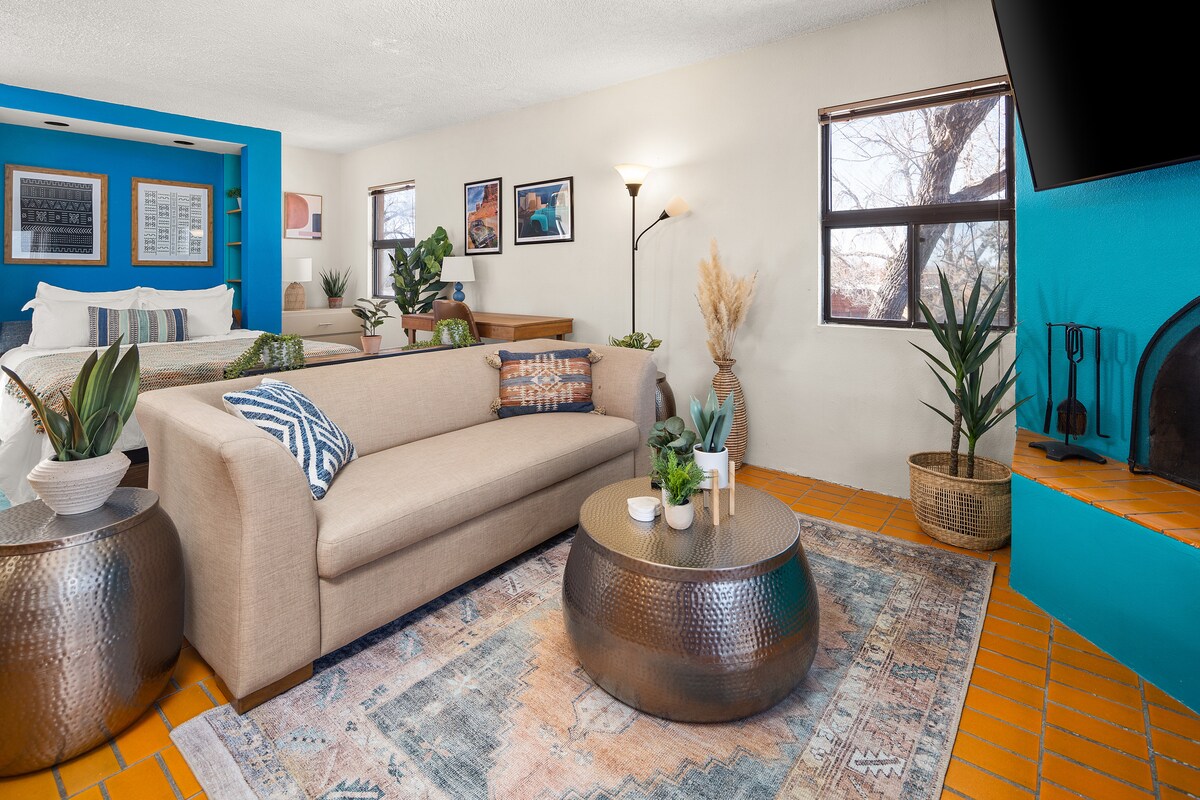 PERFECT SPOT FOR A GETAWAY! A no-smoking, one bedroom retreat-like unit has tons of character. Stroll to the Plaza and restaurants. Enjoy the private patio off the bedroom or the lovely courtyard with calming fountain and many benches. Ideal for reading, thinking or meditation. Many guests have been "working from home with a different view"! One family dog (under 25#) is OK – and you must inquire in advance. The cozy paradise is a combination of the Taos vibe with contemporary touches.