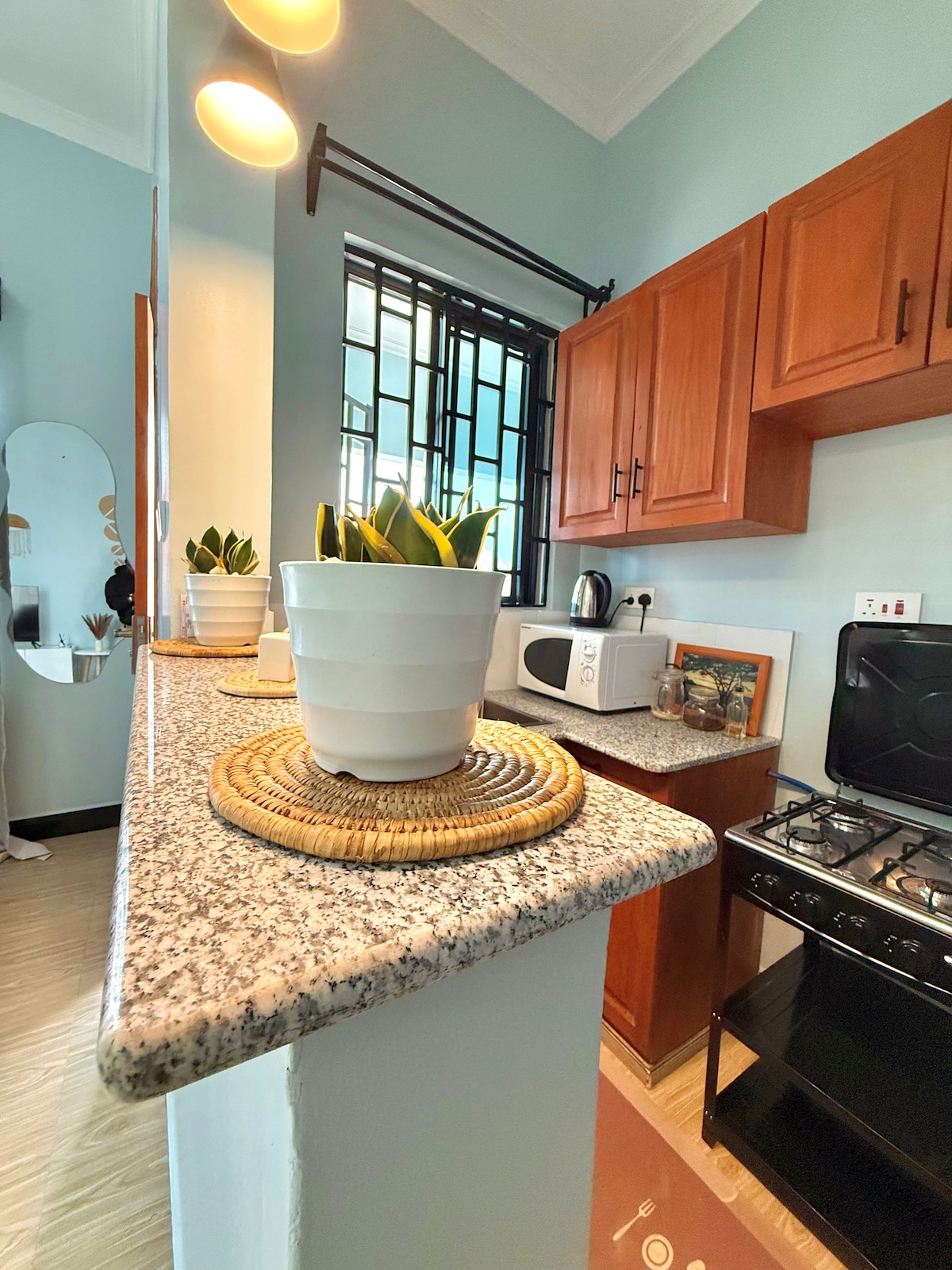 Welcome to your cozy boho-style studio retreat in Moshono area Arusha City. Relax in a sun-drenched boho studio, where cozy comfort, modern style, and natural light create the perfect retreat for couples, solo travelers, business guests, and long-stay expats. Enjoy a comfortable sleeping area, a cozy dedicated workspace, fast Wi-Fi and free secure parking. Breakfast essentials including bread, eggs, milk, yoghurt, and fresh apples are provided for a relaxed start to your day.