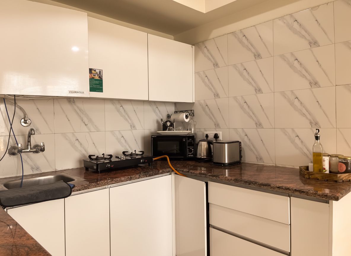 A modern luxury 2BHK with 1 Luxurious bathroom with premium fittings—curated for refined comfort and seamless living.Calm tones,layered lighting, and thoughtful detailing shape an inviting atmosphere throughout.The layout flows naturally between living,dining, and resting areas,supported by a well-equipped kitchen,premium linens, and reliable connectivity.Clean lines, subtle finishes, and attentive upkeep reflect quiet sophistication,offering a polished stay defined by comfort,clarity, and ease.