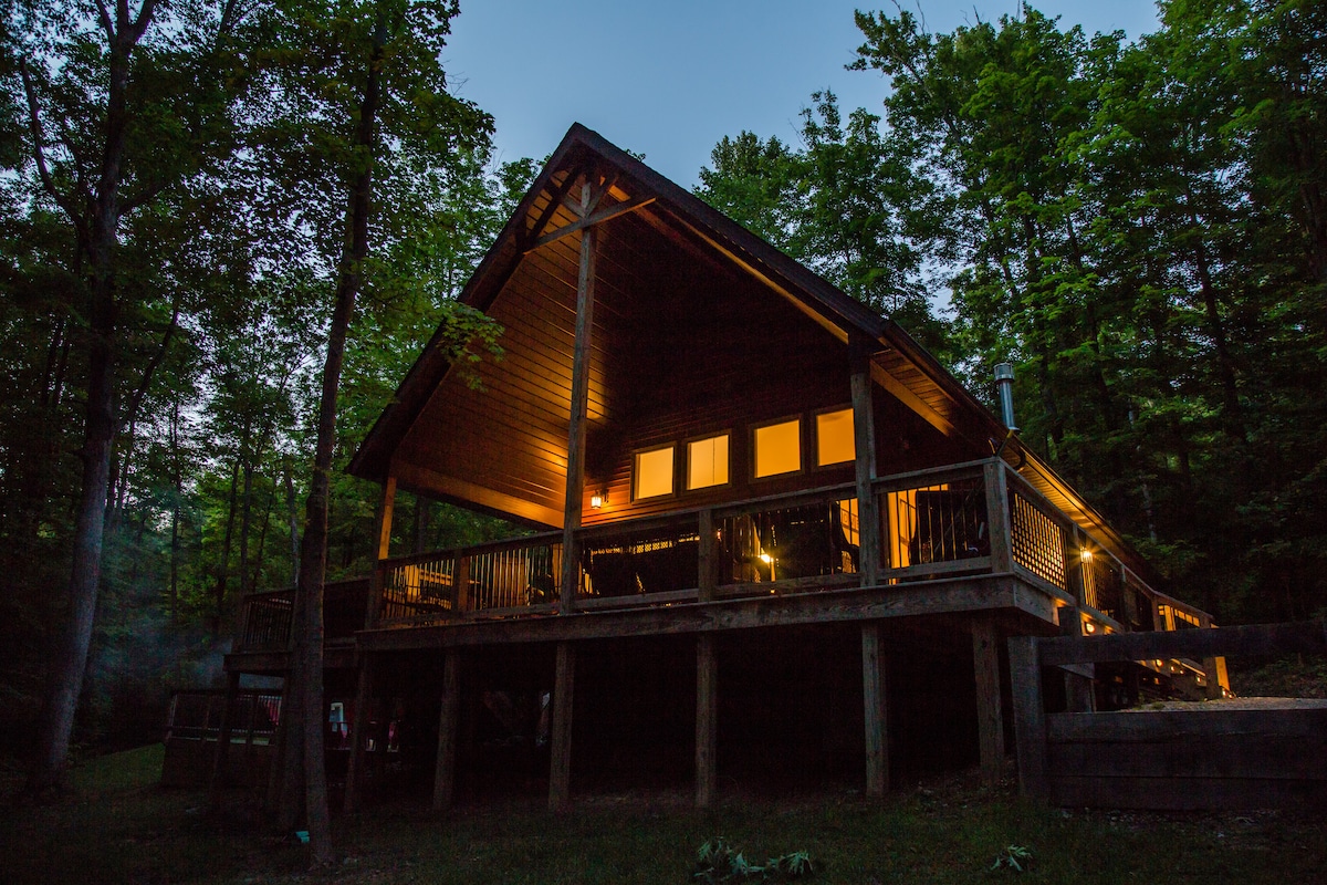 Ta wyjątkowa chatka zaprasza Cię do doświadczenia surowego, zachodniego luksusu w sercu Ohio! Pełen zabawy dla Ciebie, Twoich przyjaciół i rodziny; obiekt oferuje kryte przestrzenie rekreacyjne, Little Whiskey Lounge and Bar w stodole (do użytku w ciepłe dni) i zaciszne jacuzzi! W pobliżu parku stanowego Mohican i wszystkich leśnych zabaw, które wiążą się ze stolicą kajakarstwa Ohio. Zaledwie kilka minut od pieszych wędrówek, jazdy na rowerze, obserwacji ptaków i pływania lub wiosłowania po najbardziej ekscytującej rzece w Ohio! Na pewno Ci się spodobają!