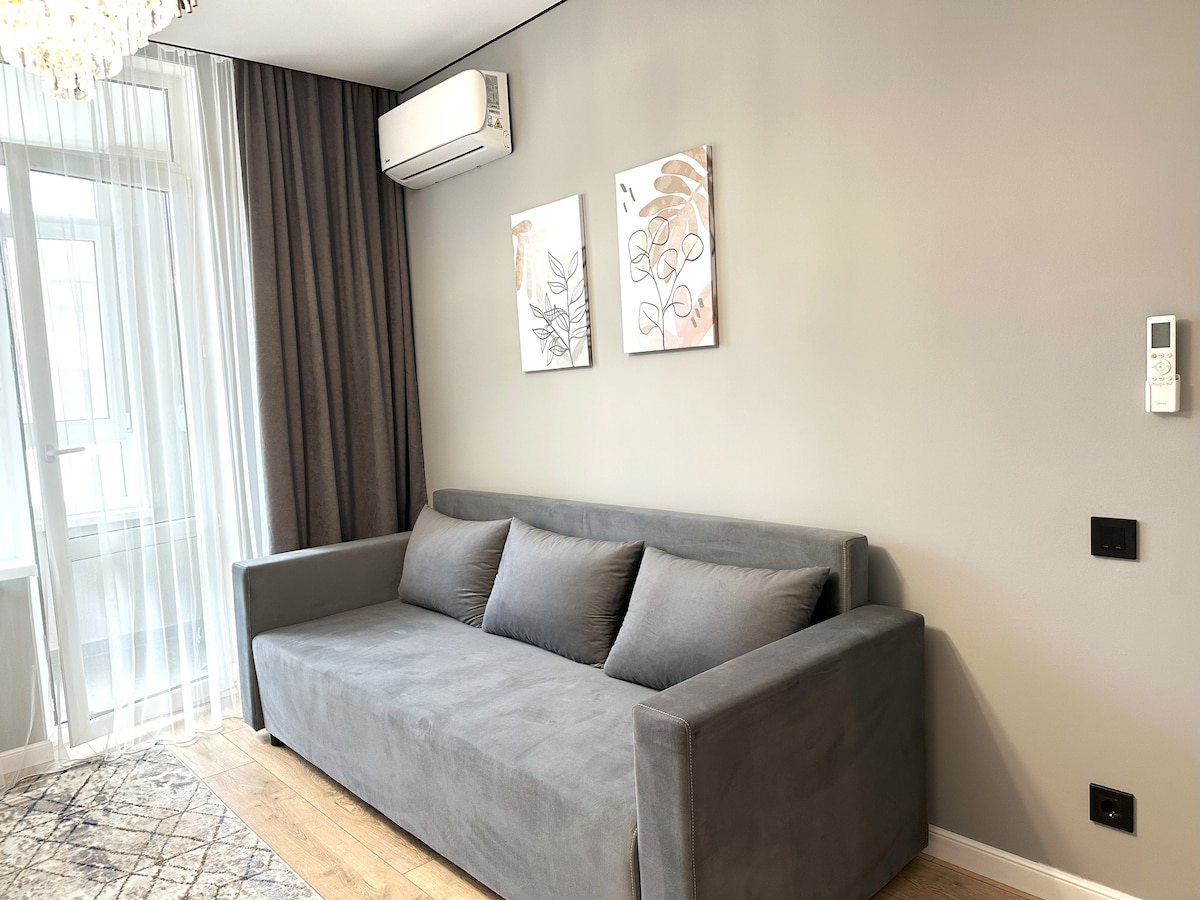 Добро пожаловать в наши апартаменты в ЖК За Рекой ✨ Уютная и просторная студия в центре города, недалеко от Expo, Mega Silk Way и Ботаническим садом. Подходит для семей и для командировочных, так как: у нас не курят, можно с детьми и домашними животными. Преимущества: • бесконтактный заезд в любое время • аэропорт-10–15 минут на машине • бесплатная парковка во дворе • мини бар с удалённой оплатой-всё под рукой, без поиска магазинов.