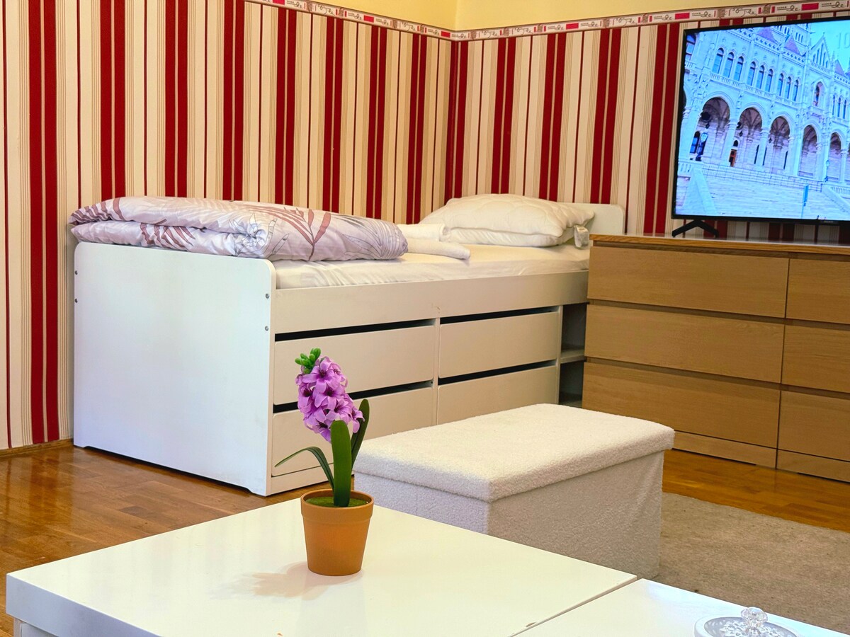 Uroczy klimatyzowany apartament znajduje się na drugim piętrze z oknami i balkonem, który wygląda na zieloną ulicę, dając mu cichą, przyjemną atmosferę. Mieszkanie znajduje się w centrum Budapesztu, okolica nazywa się „małym Paryżem”. Możesz wejść za pomocą łatwego systemu zameldowania: nie potrzebujesz kluczy, tylko dwa kody, które Ci podaję i jesteś w środku. Posiada jeden pokój z podwójnym łóżkiem. Znajduje się tu kącik kuchenny. Pralka znajduje się w łazience z prysznicem.