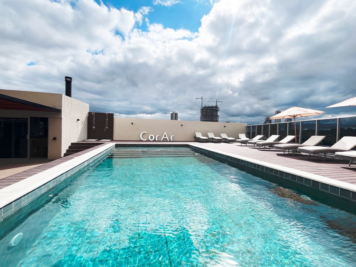 Nowoczesne mieszkanie, super wyposażone, z balkonem, grillem, panoramicznym widokiem z 24. piętra i doskonałymi usługami: -swimming-pool - Coworking - Quincho - Kino – Parking przy windzie (mały/średni samochód) - Bezpieczeństwo 24/7 Świetna okolica: – 5 minut od Corporate Axis, Shopping del Sol i Paseo La Galería. – 10 minut od Costanera i mostu Héroes del Chaco. – 15 minut od międzynarodowego lotniska Silvio Pettirossi. Wi-Fi · Smart TV · Materace premium