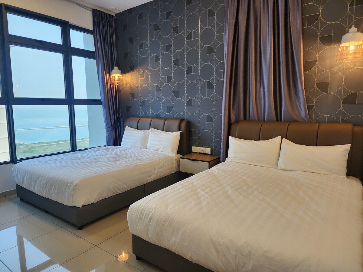 Our apartment is located at The Shore, Melaka, featuring a modern design and a comfortable living space. It offers high-quality bedding, essential amenities, and stunning city or river views. Guests can also enjoy the facilities within the building, including an infinity pool, a gym, and a shopping mall, making it ideal for family vacations or trips with friends.
