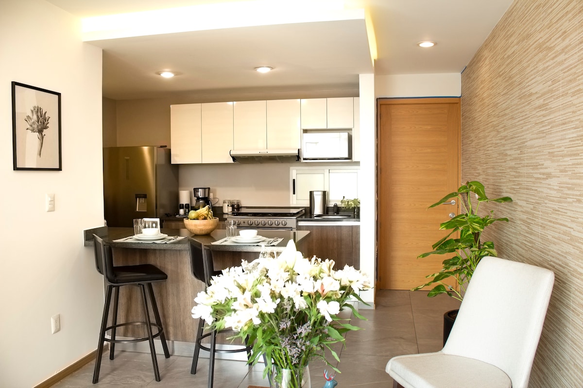 Nowe mieszkanie o nowoczesnym wystroju, pięć przecznic od alei Masaryka. Apartament znajduje się w samym sercu jednej z najmodniejszych dzielnic miasta, w pobszarze muzeów, różnych restauracji, kin, barów i centrów handlowych. Okolica jest bardzo przyjemna do spacerowania, a jej strategiczne położenie pozwala w kilka minut dotrzeć do Paseo de la Reforma, Muzeum Antropologii i Anioła Niepodległości. W budynku znajduje się siłownia, przestrzeń coworkingowa, taras z dobrym widokiem i części wspólne.