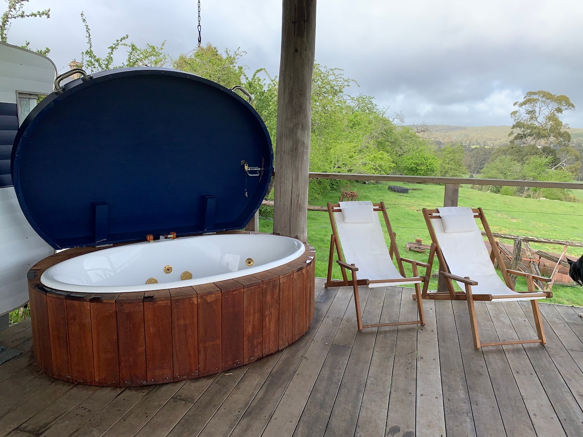 To miejsce jest wyjątkowe! Pięknie odrestaurowany autobus szkolny stoi teraz wśród drzew eukaliptusowych. Będziesz chłonąć ciepło porannego słońca, słuchając życia ptaków i obserwując owce, krowy i kangury na sąsiednich padokach. Prywatność i spokój pozwolą Ci poczuć się jak w domu. Niezależnie od tego, czy czytasz w hamaku, pijesz wino, oglądasz zachód słońca, relaksujesz się w spa, grasz w gry planszowe, czy gotujesz na grillu Weber. Nieodpowiednie dla dzieci lub zwierząt.
