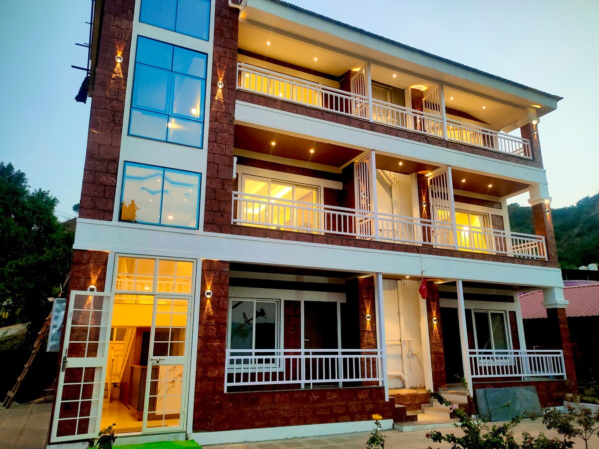 Luksusowa willa 6BHK z widokiem na góry, świeżym powietrzem i prywatnym basenem — idealna na rodzinne wypady lub imprezy. Przestronne salony, eleganckie sypialnie z balkonami, pełna kuchnia, inteligentne telewizory, Wi-Fi i codzienne sprzątanie. Ciesz się jedzeniem na świeżym powietrzu, bujnymi ogrodami i spokojną okolicą. Idealne na uroczystości lub spokojne wypady, zaledwie kilka minut od malowniczych szlaków i lokalnych atrakcji. Idealne połączenie przyrody, wygody i stylu.