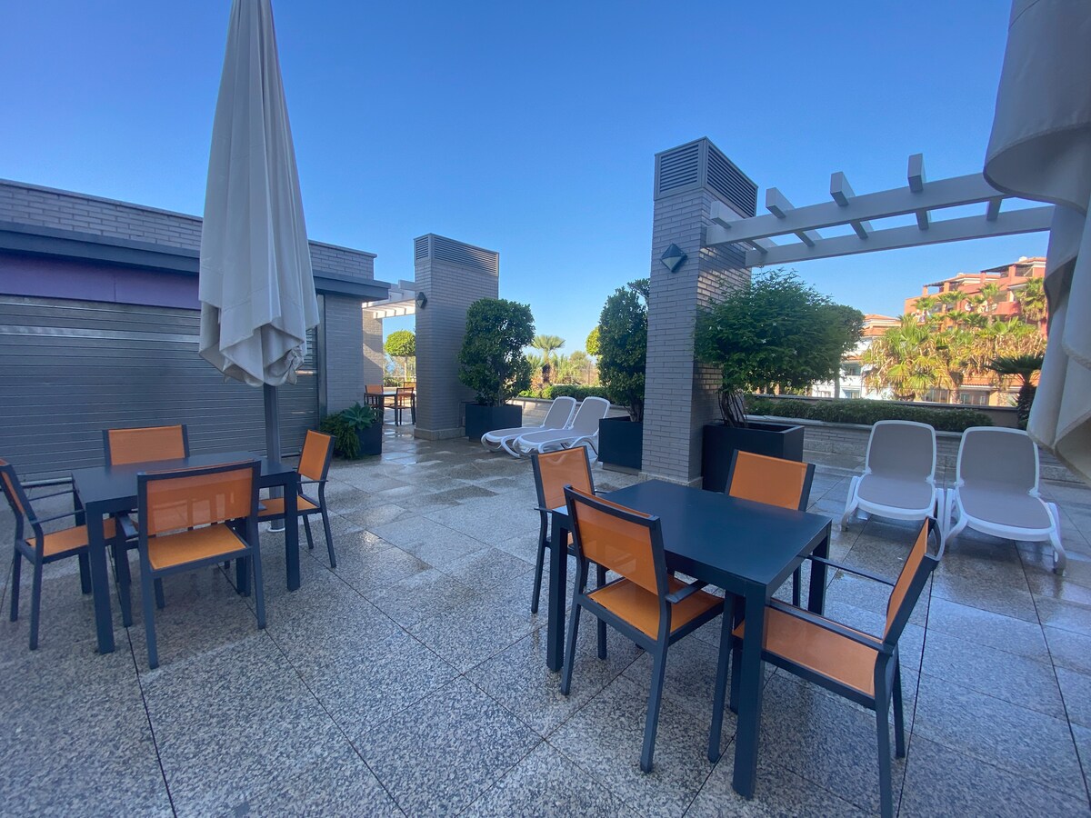 Elviria Hills Living znajduje się we wschodniej części Marbelli – miejscu, w którym można zwolnić tempo i poczuć się jak w domu od momentu przyjazdu. Ten apartament typu Superior z jedną sypialnią oferuje przestrzeń, prywatność i komfort na co dzień, a do tego naturalne światło, dwa prywatne tarasy i widok na basen. Samodzielne zameldowanie i wymeldowanie, bezpłatne sprzątanie co trzy dni, Wi-Fi, telewizor Smart TV i w pełni wyposażony aneks kuchenny. Plaże, golf i miasto Marbella są w pobliżu samochodem.