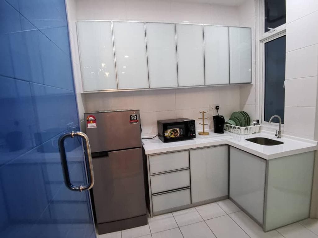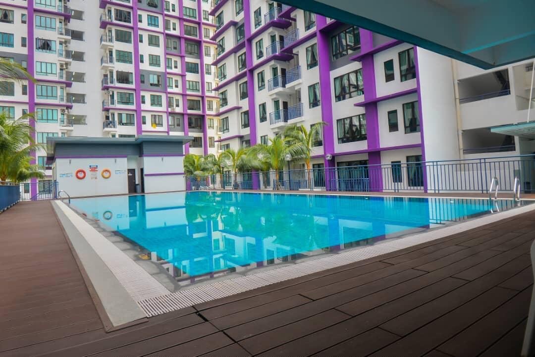 Max:7 Adult 1 Car Park | Muslim-Friendly | Large balcony for sunset views Bedroom Setup -Bedroom 1: Queen bed, A/C, fan, attached bathroom -Bedroom 2: Queen bed, A/C, fan -Bedroom 3: Single bed, A/C, fan #Extra single bed available. Amenities -WiFi+TV+Netflix(May log in with personal acc) -towels -washing machine -iron & board -refrigerator -microwave -rice cooker -water filter -plates & cutlery. Facilities -Swimming pool -gym -badminton court -park No smoking & pets RM50 refundable deposit