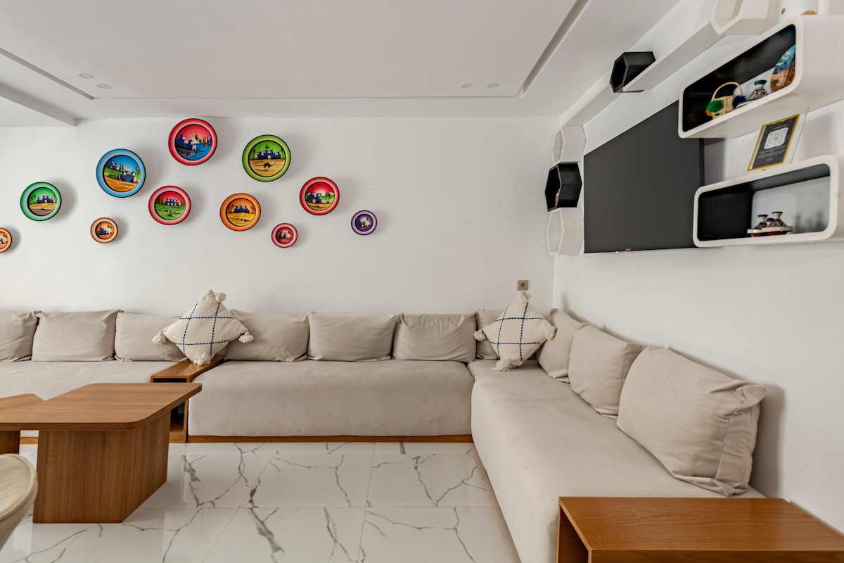 Poznaj urok naszego „Morskiego Azylu”. Ten przestronny apartament z tradycyjnym marokańskim wystrojem oferuje wspaniałe widoki na morze i znajduje się zaledwie minutę od plaży Azla. Zrelaksuj się w dużej, komfortowej części dziennej z eleganckimi meblami i misternymi detalami na suficie. Położony 15 minut od lotniska Tetouan i 1 godzinę od lotniska Tanger, jest idealny dla rodzin lub par szukających spokojnego wypoczynku. Ciesz się idealnym połączeniem komfortu i wygody tuż nad morzem.