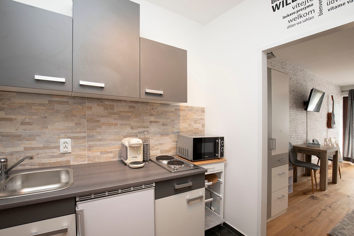 Nowocześnie urządzone mieszkanie o powierzchni 120 m² z 4 pokojami dla maksymalnie 12 osób (3 łóżka typu king-size, 6 łóżek pojedynczych). Trzy pokoje z umywalką, dwa z tarasem i widokiem na góry. Idealne dla rodzin i grup, które chcą cieszyć się spokojem i przyrodą. Szlaki turystyczne zaczynają się tuż przy domu, a do ośrodka narciarskiego jest tylko 15 minut. Z sauny, basenu i ogrodu można korzystać w zależności od pory roku. Śniadanie wliczone w cenę. Parking 5 EUR za noc, podatek turystyczny 3 EUR za osobę za noc. Relaks i aktywny wypoczynek w górach!