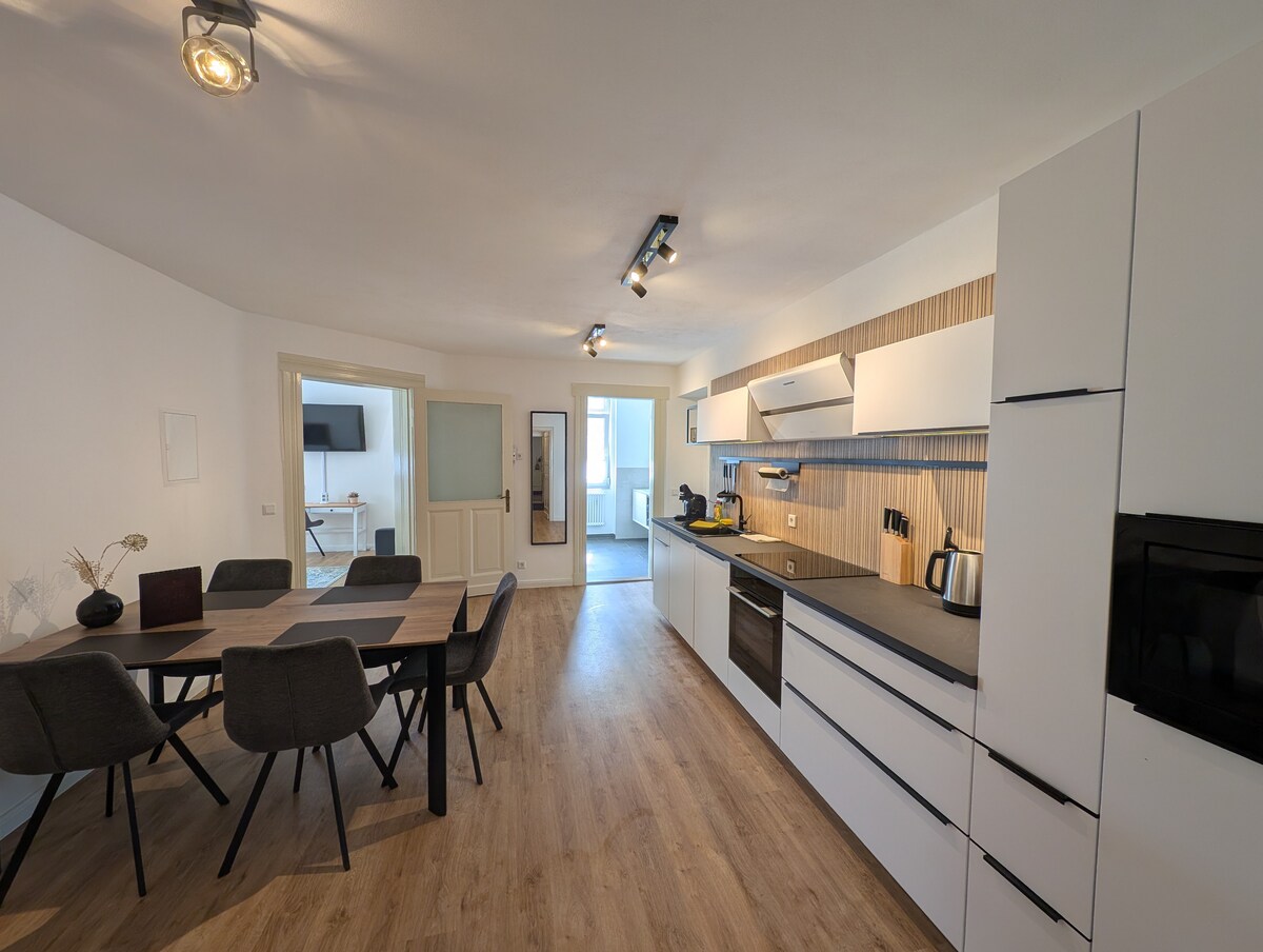 Witamy w tym luksusowym apartamencie o powierzchni 60 m², który oferuje wszystko, czego potrzebujesz do udanego pobytu w Gera: → Luxuriöses BOXSPRINGBETT (Kingsize 1.80 m breit) → wygodna sofa dla 3 i 4 osoby → Smart TV (55’’) z Netflixem i ultraszybkim Wi-Fi (1000 Mbit) → w pełni wyposażona kuchnia - salon z kawą i herbatą NESPRESSO → nowoczesna łazienka z pralko-suszarką → Bliskość centrum, restauracji i wielu sklepów.