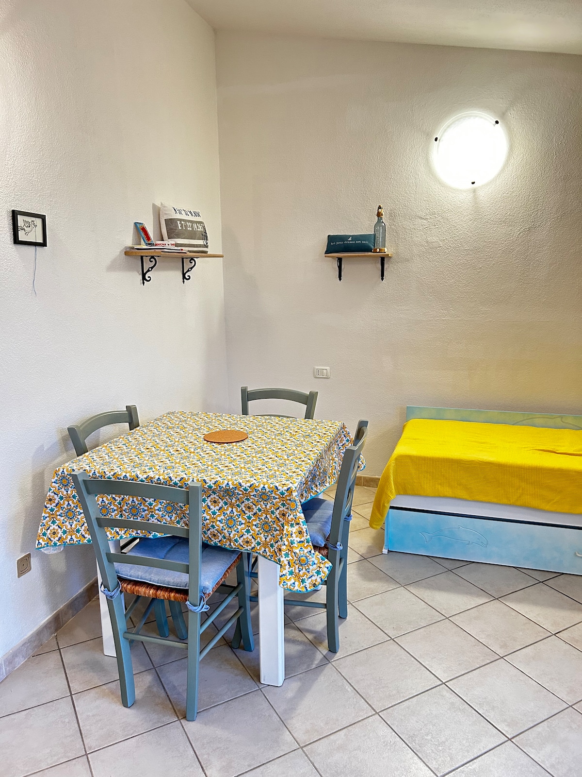 Two-room apartment with garden and large veranda overlooking the sea, newly renovated, just a few minutes from the beautiful beaches of Marinedda, Cala Rossa, Li Feruli.... One bedroom, living area with equipped kitchen, dining area, sofa bed, utility room with washing machine, large furnished veranda, and private parking space. Grocery store/greengrocer below the building, supermarkets 3 km away, bar/bistro nearby. Similar apartment available on the upper floor.