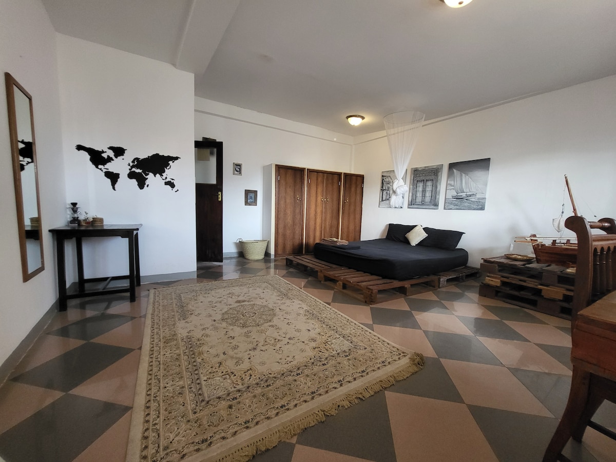 Ten przytulny, zabytkowy apartament na dachu łączy w sobie dawny urok z nowoczesnymi udogodnieniami – klimatyzacją, Wi-Fi, gorącym prysznicem i w pełni wyposażonym aneksem kuchennym. Wypij kawę o wschodzie słońca lub zimny napój o zachodzie słońca, podziwiając dachy Stone Town. Spaceruj po pobliskich targowiskach z przyprawami, odkrywaj kręte uliczki i odwiedzaj kultowe miejsca, takie jak targ Forodhani i Stary Fort. Bezpłatny odbiór z lotniska lub promu w przypadku pobytów obejmujących co najmniej 3 noce. Idealne dla par, podróżujących w pojedynkę lub profesjonalistów pracujących zdalnie.