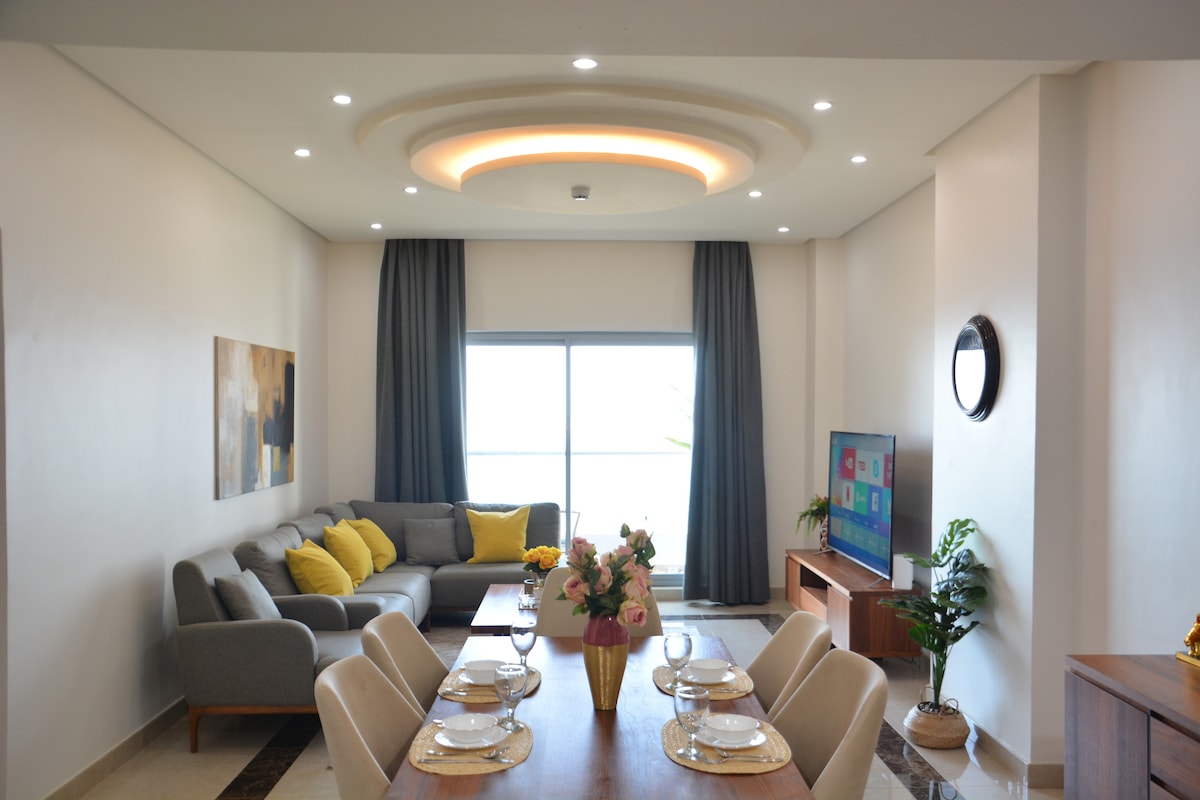 Spokojny i centralnie położony apartament z 2 sypialniami w Juffair, z balkonem i widokiem na morze. Udogodnienia obejmują basen, siłownię, bilard, ping-pong, plac zabaw dla dzieci, parę wodną i saunę. Dostarczane są bezpłatne jednorazowe przedmioty do prania.