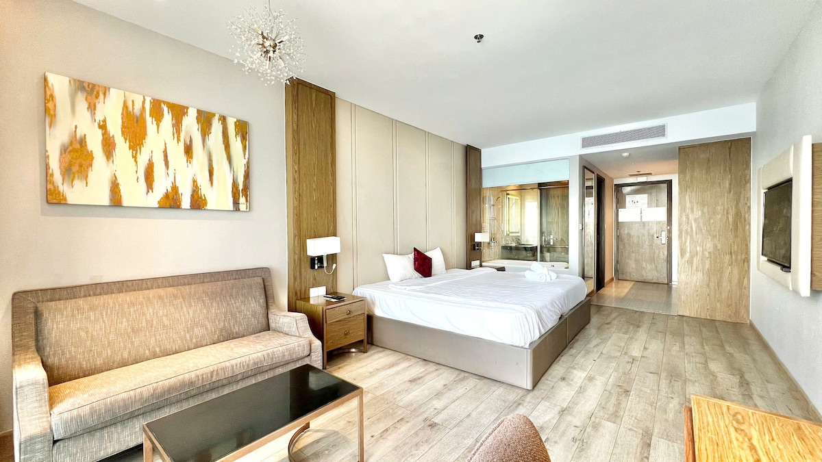 To stylowe studio na wysokim piętrze w Panorama Nha Trang oferuje idealne połączenie komfortu i nowoczesnych udogodnień. Okna sięgające od podłogi do sufitu zapewniają widok na miasto prosto z łóżka typu king size z najwyższej jakości pościelą. Przestronny układ obejmuje szerokie biurko, telewizor Smart TV o przekątnej 43 cali oraz dużą, dobrze wyposażoną łazienkę. Niezależnie od tego, czy jesteś tu w celach służbowych, czy wypoczynkowych, możesz cieszyć się spokojnym wypoczynkiem w samym sercu Nha Trang, zaledwie kilka kroków od plaży, restauracji i rozrywki.