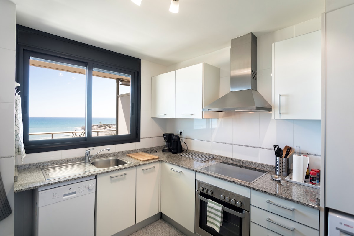 Słoneczny apartament w pierwszej linii nad morzem. Posiada taras o powierzchni 21 m2 skierowany na południe. Z bezpośrednim widokiem na plażę, większość wybrzeża i góry. Położony na północ od metropolii Barcelony. 45 minut od Placu Katalonii i 60 minut od Fira de Barcelona i MWC. W połowie Costa Brava. Restauracje otwarte przez cały rok. Wszystkie rodzaje środków transportu: pociąg i autobus. Do centrum Barcelony 2 minuty, do centrum Barcelony 7 minut. Delta del Ebre i Pireneje są niedaleko.