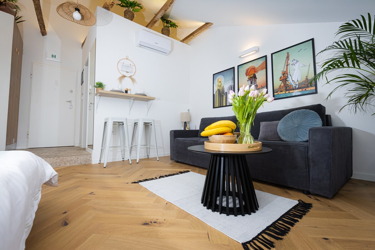 Położony w centrum miasta, pięknie nowocześnie urządzony i oryginalny nowy apartament z jedną sypialnią i salonem, kuchnią, łazienką i balkonem. Z klimatyzacją, Wi-Fi, telewizorem Smart TV. Apartament oferuje komfort i idealną lokalizację do odkrywania Rijece. Nie ma wyznaczonego parkingu, to jest centrum europejskiego miasta. W pobliżu znajduje się kilka garaży i parkingów. Wyszukaj Parging Korzo, Parking Riva lub Garaza Zagrad.