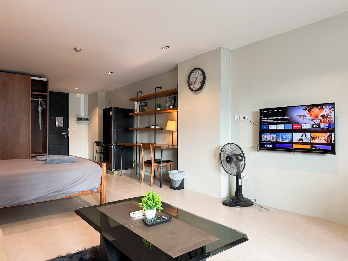 Umeblowany apartament typu studio na pobyty krótko- i długoterminowe w Silom CBD, 5-10 minut spacerem do stacji kolejki górskiej/metra. Wszystko, czego potrzebujesz, jest tuż za rogiem. Jednostka została odnowiona z drewnianą podłogą, łóżkiem typu king size/twardym materacem, 55-calowym telewizorem z płaskim ekranem, telewizorem z systemem Android, odtwarzaczem DVD, lodówką, czajnikiem, kuchenką mikrofalową, zastawą stołową, odnowioną łazienką i nową klimatyzacją. Router Wi-Fi. Całodobowa ochrona. Basen na dachu i siłownia. Na miejscu znajduje się restauracja. 7-Eleven jest po drugiej stronie ulicy.