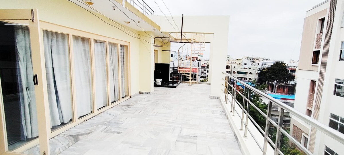 Witamy w naszym oszałamiającym apartamencie z 4 sypialniami w prestiżowej dzielnicy Road no 3 Banjara Hills. To idealne połączenie luksusu, wygody i wygody. Znajdują się tu przestronne sypialnie, stylowy salon, oddzielna jadalnia, w pełni wyposażona kuchnia i nowoczesne łazienki. Ciesz się szybkim Wi-Fi, inteligentnym telewizorem, prywatnym balkonem i bezpiecznym parkingiem. Kilka kroków od najpopularniejszych atrakcji, restauracji i sklepów. Idealne dla rodzin, grup i osób podróżujących służbowo. Zarezerwuj teraz niezapomniany pobyt!