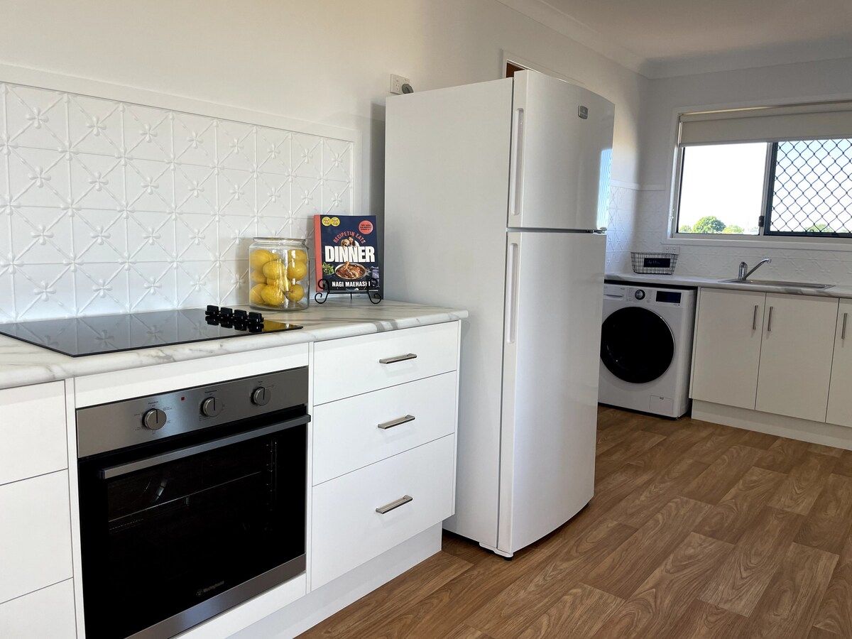 Odpręż się i zrelaksuj w tym spokojnym, stylowym domu, ładnie urządzonym i wyposażonym we wszystkie niezbędne udogodnienia, na spokojnej ulicy. Ciesz się ogrodem z nieogrodzonym trawnikiem, drzewami i ptactwem, popijając wieczorny napój w części wypoczynkowej na świeżym powietrzu. Doświadcz spektakularnego wschodu słońca, spacerując ścieżką botaniki do Stockmans Hall of Fame i Qantas Founders Museum. Kiedy wybierasz się do miasta, zabierz ze sobą kupon zniżkowy na 10%, aby w pełni wykorzystać możliwości zakupowe w małym sklepie z pamiątkami Spinifex Collections.