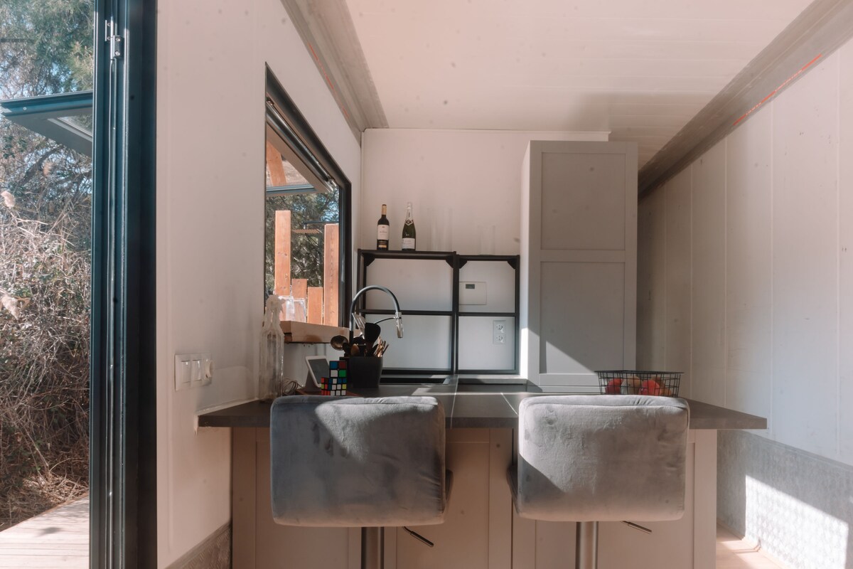 Ten mały domek wykonany z kontenera transportowego to Twój prywatny raj otoczony bujnymi lasami i zaledwie 800 metrów od plaży. Obudź się na dźwięk śpiewu ptaków i wiatru szelest drzew, podziwiaj oszałamiające widoki na las przez duże okna i naładuj się w stylu życia poza siecią biegnącą na panelach słonecznych i wodzie ze studni. W pełni wyposażona kuchnia z barem śniadaniowym, wygodną sypialnią oraz prysznicem wewnątrz i na zewnątrz zapewnia wszystko, czego potrzebujesz, aby się zrelaksować i cieszyć.