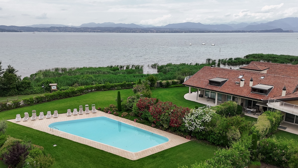 Ten elegancki apartament na parterze, położony kilka kroków od jeziora Garda, położony w wolnostojącej willi, oferuje zapierający dech w piersiach widok na jezioro, prywatny taras, krajobrazowy ogród i dostęp do naszego basenu ze słoną wodą - idealne miejsce na drinki o zachodzie słońca, spokojne popołudnia i czysty relaks. Zanurz się w spokoju ogrodu, zrelaksuj się przy basenie i rozsmakuj się w uroku życia nad jeziorem. Bezpieczny parking w garażu – rzadkość nad jeziorem Garda – jest wliczony w cenę.