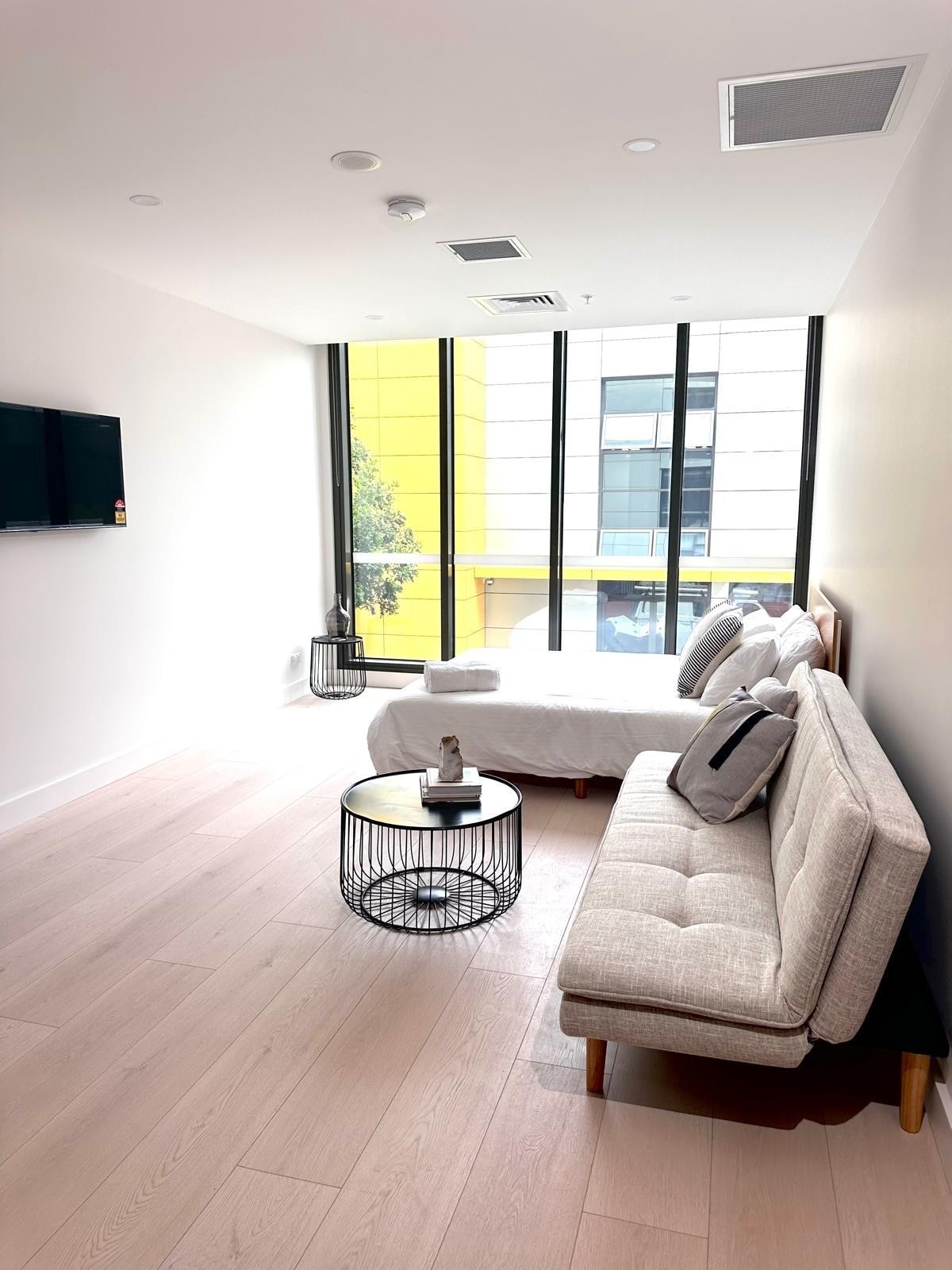 True central Newtown! Steps to everything! Undoubtedly the best unit in this beautiful complex, set around a leafy garden Atrium, private balcony, rooftop garden with city views, light, sunny, Triple glazed sliding door ensures quiet. Designed to the last details for discerning guest(s) seeking quiet privacy, Covid clean. Minimalist super comfortable style. AC, Wifi, timber floors, full kitchen, queen bed, washer, on the Restaurants/ cafe strip, 2 train stops city. 2 mins walk to train