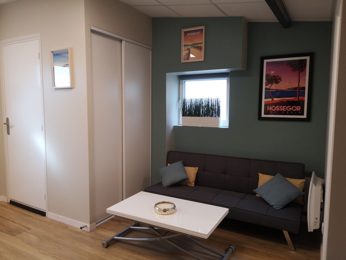 Nowy dom z 2 sypialniami o powierzchni 40 m2 pod sosnami z prywatnym ogrodem. 800 m od plaży i w pobliżu ścieżek rowerowych przez las, które prowadzą na północ do Capbreton lub na południe do Ondres. Dostęp przez wspólną ścieżkę. 2 sypialnie, z których każda może być pozostawiona z łóżkami typu king size lub podzielona na 4 pojedyncze. Funkcjonalny salon/kuchnia ze wszystkimi udogodnieniami i grillem gazowym do gotowania na zewnątrz. Zjedz kolację na patio, a następnie zjedz aperitif na kanapie pod drzewami.