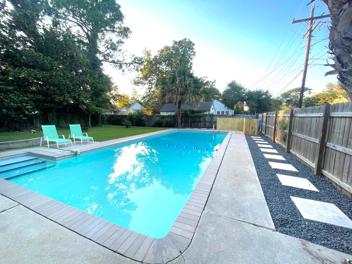 Idealny dom dla aktywnych rodzin w historycznej dzielnicy. Przestrzeń do rozrywki na świeżym powietrzu jest idealna dla dzieci i dorosłych, w tym basen, zestaw do zabawy, kuchnia na świeżym powietrzu, jadalnia, salon, telewizor, chatka Tiki, huśtawki i hamaki! Może pomieścić dwie rodziny. Sypialnia główna i pokój gościnny mają łóżka typu queen. W pokoju z łóżkiem piętrowym znajduje się pełnowymiarowe łóżko piętrowe z podwójnym łóżkiem. Pełne łóżko w pokoju kosmicznym mieści dwóch astronautów. Dodatkowy pokój z pełnowymiarową leżanką to idealne miejsce do spędzania czasu dla dzieci! Garaż na dwa samochody z ładowarką Tesla.