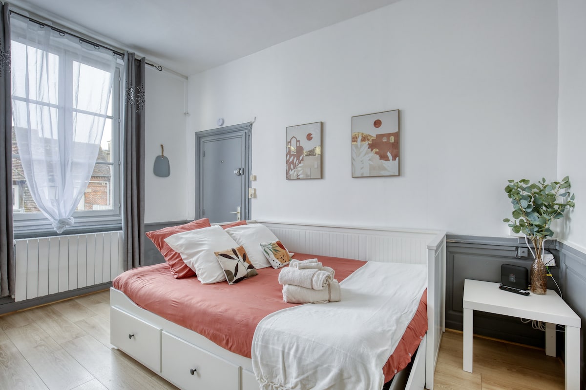 🚨 ✌️Zatrzymaj się w Beauvais w wyjątkowy sposób w przytulnym, eleganckim apartamencie w centrum miasta z wyjątkowym widokiem na katedrę św. Piotra🤩, klejnot sztuki gotyckiej, jej chór jest najwyższy na świecie. Można go podziwiać na poprzecznym tarasie, na którym można zjeść ❤️ 10 minut spacerem od dworca kolejowego, 8 minut samochodem od lotniska. - Centralna lokalizacja -4 łóżka (podwójne + sofa) - Wi-Fi + TV 📺 160 kanałów - Umeblowana kuchnia – Ekspres do kawy ☕️ i🫖