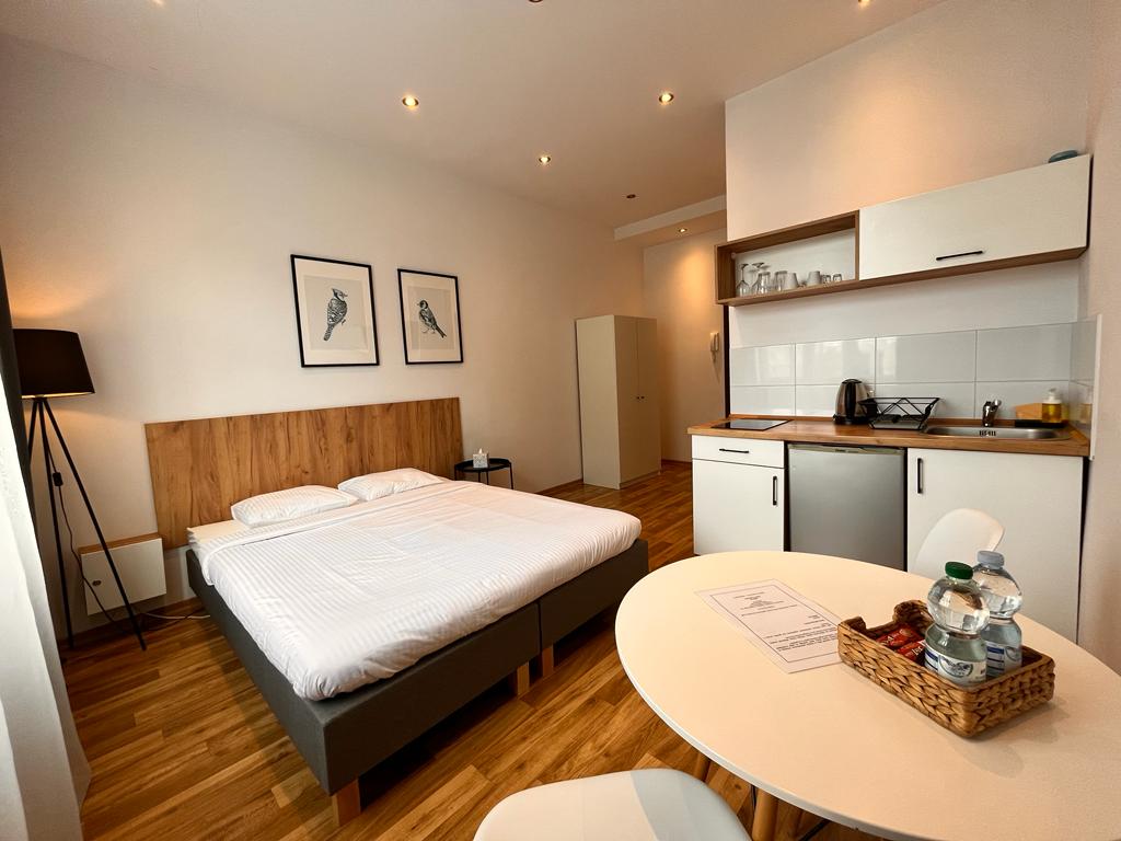 Samodzielny, nowoczesny apartament o powierzchni 45 m2. Salon, sypialnia, kuchnia i łazienka. Apartament po generalnym remoncie w 2018r. Możliwość noclegu dla 4 osób w dwóch pomieszczeniach: w sypialni (2 łóżka: 160x200 i 90x200) i salonie na rozkładanej sofie. W pełni wyposażona kuchnia. Wygodny prysznic przedzielony szybą. Pralka, szafka na kosmetyki. Ręczniki, podstawowe kosmetyki. Miło i przytulnie zarówno dla osób podróżujących biznesowo jak i turystycznie. Odbiór z lotnisk w całym kraju.