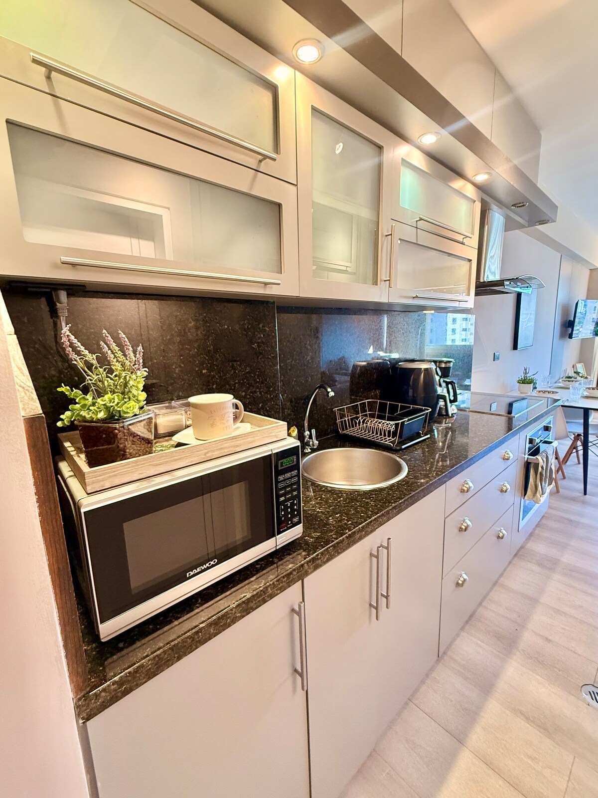 Disfruta una estancia sofisticada en este apartamento de diseño, donde cada detalle ha sido cuidadosamente seleccionado para tu confort. Ambientes amplios, decoración contemporánea, cocina totalmente equipada y una terraza con vista hermosa a la ciudad. El apartamento cuenta con inversores de electricidad para garantizar tu comodidad incluso ante fallas de luz. Un espacio pensado para tu descanso y tranquilidad.