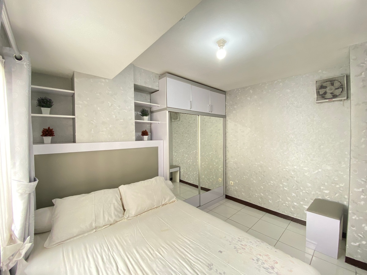 „Witamy w naszym przytulnym mieszkaniu z 2 sypialniami w Bekasi! Ciesz się dobrze wyposażoną kuchnią, przytulną przestrzenią mieszkalną i malowniczymi widokami z balkonu. Zanurz się w basenie olimpijskim, pozostań w formie na siłowni na świeżym powietrzu lub biegaj po bieżni. Dzięki całodobowej ochronie i karcie dostępu Twoje bezpieczeństwo jest dla nas najważniejsze. 5 minut spacerem do kawiarni, restauracji i centrum handlowego. Dostępne Wi-Fi, Netflix i podgrzewacz wody. Niezależnie od tego, czy podróżujesz służbowo, czy rekreacyjnie, nasz apartament zapewnia niezapomniany pobyt. Zarezerwuj teraz i poznaj urok Bekasi!”