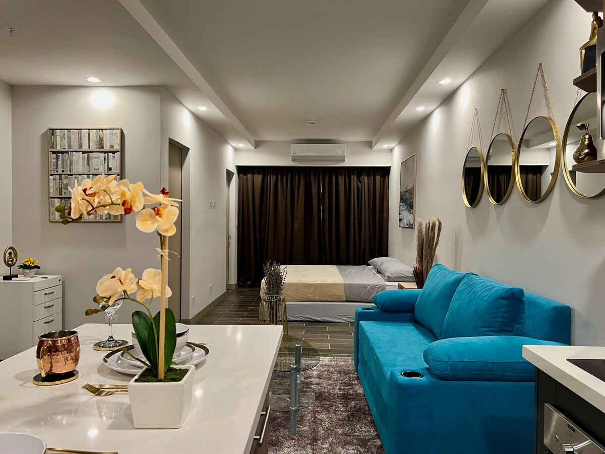 Ciesz się stylowym doświadczeniem w tym centralnie położonym domu. Ten apartament typu studio został zaprojektowany z myślą o nowoczesnym, eleganckim i wyrafinowanym akcentem, ma bezpłatny parking p-220, jest plac ze sklepami, aptekami, supermarketami i restauracjami. Ponadto w pobliżu apartamentu znajduje się kręgielnia. W budynku znajduje się sala spotkań, prywatne mini kino, siłownia, taras z widokiem na basen i całodobowa ochrona.