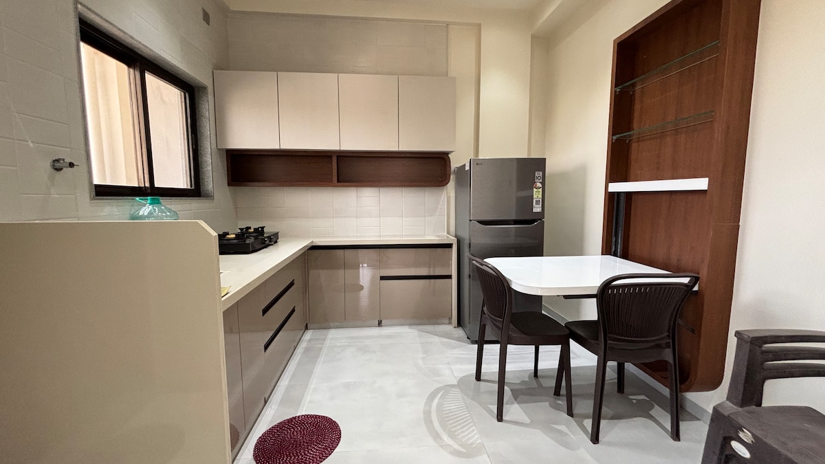 Modern furnished top-floor 1BHK in Balajinagar, Sangli, near Kupwad & Miraj MIDC. Bright living room with large glass window and open views, 55” Smart TV, high-speed WiFi and sofa-cum-bed. Fully equipped modular kitchen, washing machine, bedroom with work desk, hot water and parking. Ideal for corporate stays, couples and small families. Self check-in available.