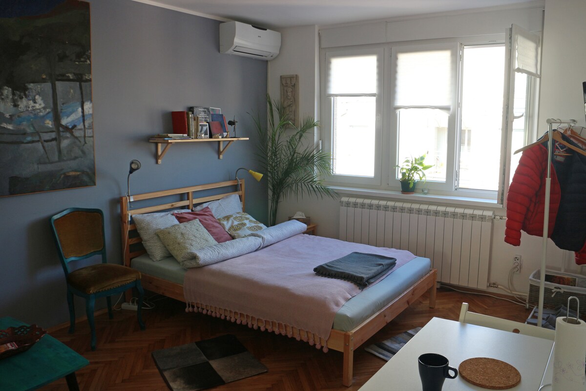 Nowo odnowione studio, w samym sercu najpopularniejszej ulicy w mieście, pełne światła i pięknych obrazów oraz płaskorzeźb. Jest tu duża łazienka z kabiną prysznicową, wentylatorem i pralką z opcją suszenia. W pokoju znajduje się jedno podwójne łóżko (140 x 200 cm) i rozkładana sofa. Możesz spojrzeć na miasto i ulicę pełną drzew pod oknami.