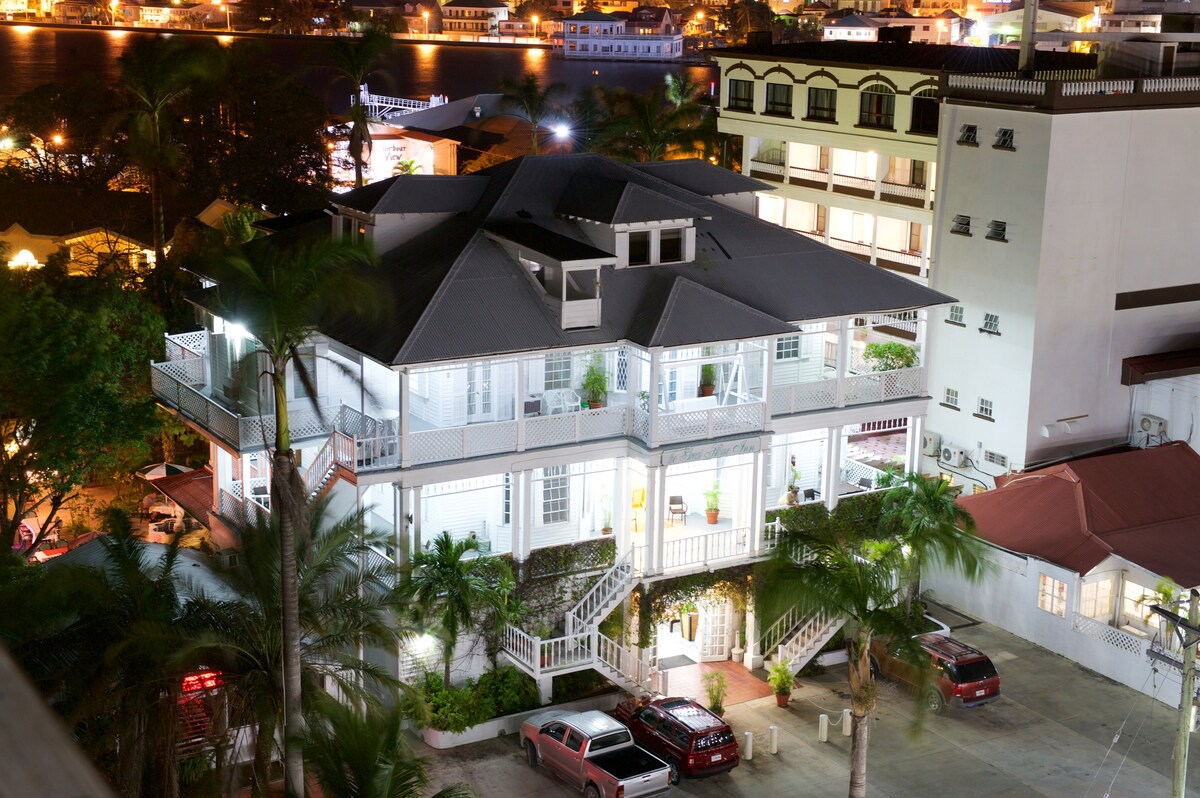 This Magnificent Colonial Home is conveniently located in the Tourism Zone of Belize City, just across from the Radisson Fort George Hotel, within walking distance to the Water Taxis, Tourism Village, Restaurants, Museum, Parks, Light House, Downtown, Banks and within one hour from major Touristic Adventures. Nasze kolonialne dziedzictwo i atmosfera są wiernie zachowane we wszystkich pokojach gościnnych. Każdy z nich jest indywidualnie dopasowany do wielu gustownych i wygodnych spotkań.